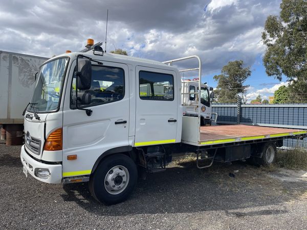 Pelagia has a Medium Rigid (MR) class crew-cab Hino truck for hire — a 7-seater workhorse with a 7.7 L engine, 6-speed manual overdrive gearbox, flat tray, and air brakes to the rear. The truck is rated to tow up to 7.5 tonnes and can be supplied with either a 127 mm Bartlett coupling or a standard tow ball, depending on your requirements.